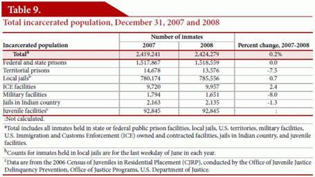 | Keywords: Total US inmates 2007-8.gif United States incarcerated population December 31 2007 and 2008 Total includes all inmates held in state or federal public prison facilities local jails U S territories military facilities U S Immigration and Customs Enforcement ICE owned and contracted facilities jails in Indian country and juvenile facilities http //bjs ojp usdoj gov/index cfm ty pbdetail iid 1763 Prisoners in 2008 NCJ 228417 December 2009 report from the U S Bureau of Justice Statistics Table 9 is from page 8 of the http //bjs ojp usdoj gov/content/pub/pdf/p08 pdf PDF file William J Sabol Ph D and Heather C West Ph D BJS Statisticians Matthew Cooper BJS Intern Correctional population statistics for the United States PD-USGov |