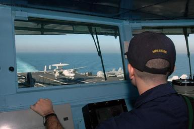 | Keywords: Touch and Go DVIDS48792.jpg en Lt Matthew Sklerov watches from the pilothouse as an E-2C Hawkeye assigned to the Wallbangers of Carrier Early Warning Squadron VAW 117 performs a touch-and-go aboard nuclear-powered aircraft carrier USS Nimitz CVN 68 Nimitz Carrier Strike Group and embarked Carrier Air Wing 11 are deployed in the 5th Fleet area of operations conducting maritime operations and supporting troops participating in the Global War on Terrorism 2007-06-07 Petty Officer 3rd Class David Smart https //www dvidshub net/image/48792 070607-N-+++++-001 2007-07-01 14 20 ABOARD USS NIMITZ AT SEA PD-USGov-Military-Navy Northrop Grumman E-2C Hawkeye aircraft carrier landings USS Nimitz CVN-68 Images from DoD uploaded by Fæ |