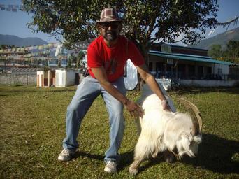 | Keywords: Tourist Rudolph.A.Furtado with Himalayan goat.(Friday 25-11-2011).jpg en Tourist Rudolph A Furtado at Tashiling Tibetan refugee Settlement in Pokhara in Nepal with a Himalayan goat The famous Pashmina wool is obtained from this breed of goats Friday 25-11-2011 Photo - Mr Labsang Lama own Rudolph A furtado Friday 25-11-2011 People with goats Changthangi Cc-zero | ||||