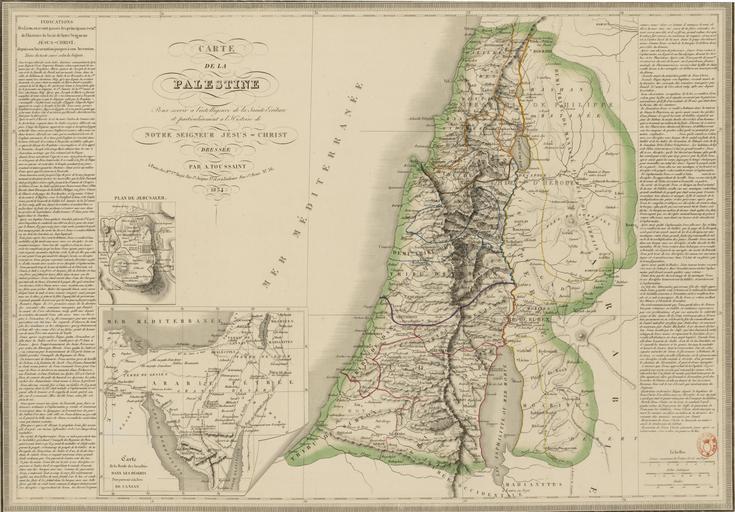 | Keywords: Toussaint, A. Carte de la Palestine. 1834.jpg  Artwork Toussaint A 18 -18 ; géo Cartographe fr Carte de la Palestine pour servir à l'intelligence de la Sainte Écriture et particulièrement à l'histoire de la Notre Seigneur Jésus-Christ / dressée par A Toussaint Échelle s ca 1 488 000 8 lieues communes de France 7 3 cm E 34°18' - E 36°19' / N 33°30' - N 31°20' 1834 cm 51 73 ; sur flle cm 62 89 5 btv1b530352766 département Cartes et plans Ge DL 1834-35 object history exhibition history credit line accession number place of creation ark /12148/btv1b530352766 <gallery> File Toussaint A Carte de la Palestine 1834 B jpg File Toussaint A Carte de la Palestine 1834 C jpg File Toussaint A Carte de la Palestine 1834 D jpg </gallery> PD-old-auto-1923 1899 Old maps of Israel 1834 maps Maps in French Maps of the Tribes of Israel |