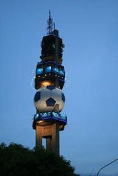 Keywords: tower broadcasting telecommunications radio tall lit light blue soccer ball giant black white evening sky