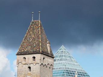 Keywords: tower building architecture pyramid glass city sky cloudiness clouds gloomy ulm
