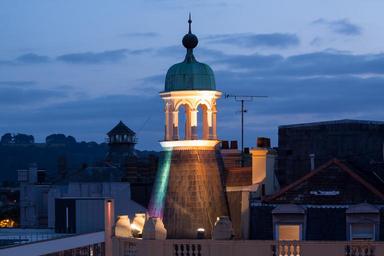 Keywords: tower great copper roof columnar antenna architecture building england dusk illuminated city
