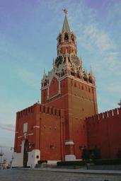 Keywords: tower kremlin wall red brick tall clock white trimmings notches spire