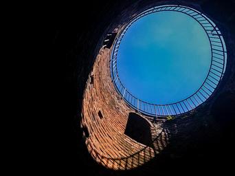 Keywords: tower top sky brick shadow circle monument old architecture crash barrier tall well bottom view