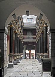 Keywords: town hall stralsund binnenhof wooden construction decorated passage paving slabs balcony parapet mv mecklenburg western pomerania baltic sea coast hanseatic city archway glass roof tent roof protected