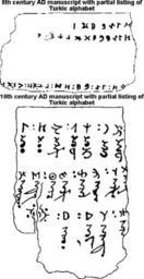 | Keywords: ToyokAndRjukokuAlphabets.gif Oldest known Turkic alphabet listings Rjukoku and Toyok manuscripts Toyok manuscript transliterates Turkic alphabet into the Uyghur alphabet From I L Kyzlasov Runic Scripts of the Eurasian Steppes Moscow Eastern Literature 1994 Кызласов И Л Рунические письменности ев азийских степей Восточная лите ату а 1994 327 с In Russian by permission of the author Personal sketch not tracing with copies of author's illustrations Sketch form personal collection not copyrighted 2005 Released under GDFL Own Barefact Copyrighted free use Old Turkic script |