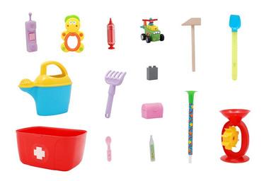 Keywords: toys plastic close-up child playing phone toy syringe helicopter mallet wooden hammer shovel watering can paddle medicine chest chest spoon thermometer whistle lego element mill