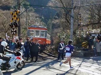 | Keywords: Tozan Kowakidani cross Ekiden Meidai.jpg  en When the runner of Hakone-ekiden Relay Race passes Hakone Tozan Railway stops the train in this side of the railroad crossing 35 24009 139 05402 2010 Hakone Ekiden Hakone Tozan Type Moha 1 Kowakidani crossing Meiji University Athletic club |