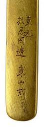 | Keywords: Tôzan - Kozuka with Flowers - Walters 5112933 - Mark A.jpg A large chrysanthemum and another flower decorate the front of the kozuka This is part of a mounted set between 1850 1912 Edo-Meiji gold silver shakudo cm 20 3 accession number 51 1293 3 13059 William T / Henry Walters Collection Baltimore date and mode of acquisition unknown Walters Art Museum Henry Walters Acquired by William T or Henry Walters Inscription Tôto oite Shinobugaoka atari; Translation in the area of Shinobugaoka Tokyo; Signature Tôzan koku; Translation carved by Tôzan place of origin Tokyo Shinobugaoka Japan Walters Art Museum license Tosogu Japanese sword fittings in the Walters Art Museum Media contributed by the Walters Art Museum needs category review Tôzan |