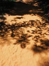 Keywords: traces sand tracks in the sand footprints yellow orange ochre colours shoe print shoe sole imprint sole imprint light and shadow shadow play sand road