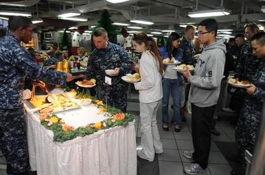| Keywords: Traditional Christmas dinner DVIDS353272.jpg en Sailors and their families are treated to a traditional Christmas dinner on board the aircraft carrier USS Ronald Reagan The ship's supply department prepared the multi-course meal and served more than 300 sailors and family members Ronald Reagan is currently moored in its home port of San Diego preparing for an upcoming deployment 2010-12-25 U S Navy photo by Petty Officer 3rd Class Oliver Cole https //www dvidshub net/image/353272 101225-N-+++++-026 2010-12-26 11 41 SAN DIEGO CA US PD-USGov-Military-Navy Mess decks of USS Ronald Reagan CVN-76 Images from DoD uploaded by Fæ |