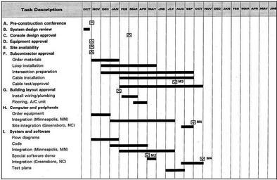 | Keywords: Traffic Control Project milestone Schedule Bar Chart.jpg en Greensboro NC Traffic Control Project milestone Schedule; This figure shows the use of bar charts as a method of project scheduling This bar chart for the Greensboro North Carolina Traffic Control System depicts the time relationship for completion of the various project tasks Starting and ending dates and durations are shown for the various tasks as well as milestones the start or completion of a task The interdependency of tasks may be indicated by a dashed line or other symbol e g M6 indicates the interdependency of acceptance tests for controller assemblies and the installation of communications lines http //ops fhwa dot gov/publications/fhwahop06006/images/fig12_4b jpg image in Traffic Control Systems Handbook Chapter 12 Design and Implementation United States Department of Transportation - Federal Highway Administration Last modified January 23 2009 File Traffic Control Project milestone Schedule Bar Chart 2 jpg PD-USGov Project scheduling |