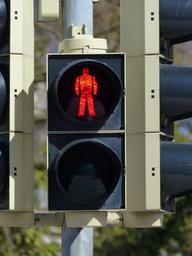 Keywords: traffic lights beacon rules of the road traffic light signal red light stand still footbridge pedestrian males little green man traffic signal traffic road sign road light signal signal lamp