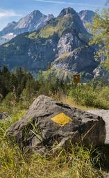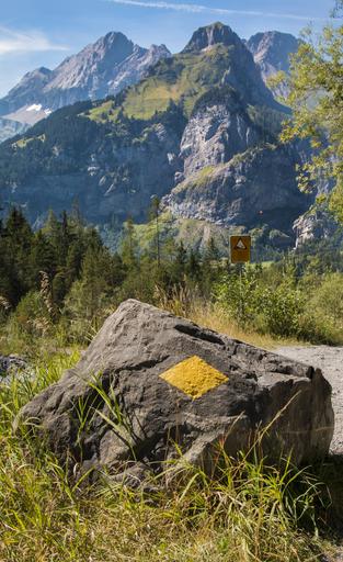 Keywords: trail trail signs directory mark waymarks mountains hiking travel holidays holiday marking direction signpost signposts milestone switzerland kandersteg yellow