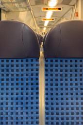 Keywords: train seat railway travel zugfahrt empty on the go wagon passengers public means of transport exit headrest upholstery deutsche bahn