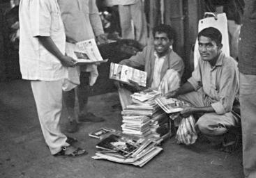 | Keywords: mennonite board of missions mennoniteboardofmissions india train trains train station trainstation book books vendor book vendor bookvendor train station platform trainstationplatform platform magazine magazines people groupshot blackandwhite monochrome black and white Caption: On every station platform in India, books and magazines are sold. The book seller carries his books by hand from train window to train window, or sets up shop on the platform whenever people gather. The more prosperous book vendors can afford a four-wheel cart to convey his books up and down the station platform. Most popular are the numerous pocket books in English and Hindi. Citation: Mennonite Board of Missions Photographs, 1898-1967. IV-10-007.2 Box 4 Folder 10. Mennonite Church USA Archives - Goshen. Goshen, Indiana. Caption: On every station platform in India, books and magazines are sold. The book seller carries his books by hand from train window to train window, or sets up shop on the platform whenever people gather. The more prosperous book vendors can afford a four-wheel cart to convey his books up and down the station platform. Most popular are the numerous pocket books in English and Hindi. Citation: Mennonite Board of Missions Photographs, 1898-1967. IV-10-007.2 Box 4 Folder 10. Mennonite Church USA Archives - Goshen. Goshen, Indiana. |