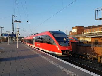 Keywords: train traffic deutsche bahn railway station regional train railway public means of transport transport red locomotive rail traffic platform travel münster westfalen