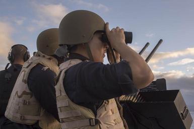 | Keywords: Training aboard USS San Diego 140802-N-IK388-007.jpg en Sailors assigned to the amphibious transport dock ship USS San Diego LPD 22 Small Craft Action Team SCAT stand watch on the bridge wing during a training event San Diego is on its maiden deployment as a part of the Makin Island Amphibious Ready Group to promote peace and freedom of the seas by providing deterrence humanitarian aid and disaster response while supporting the Navy ™s Maritime Strategy in the U S 7th and 5th Fleet areas of responsibility U S Navy photo by Mass Communication Specialist 2nd Class Stacy M Atkins Ricks/Released 2014-08-02 Petty Officer 2nd Class Stacy Atkins Ricks https //www dvidshub net/image/1482926 140802-N-IK388-007 2014-08-05 02 19 PACIFIC OCEAN PD-USGov-Military-Navy USS San Diego LPD-22 Images from DoD uploaded by Fæ |