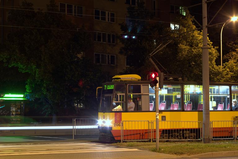 Keywords: tram transport communication rails tracks traction warsaw street night travel light flash yellow red night life way horse tramway the vehicle passenger city agglomeration package the intersection stop