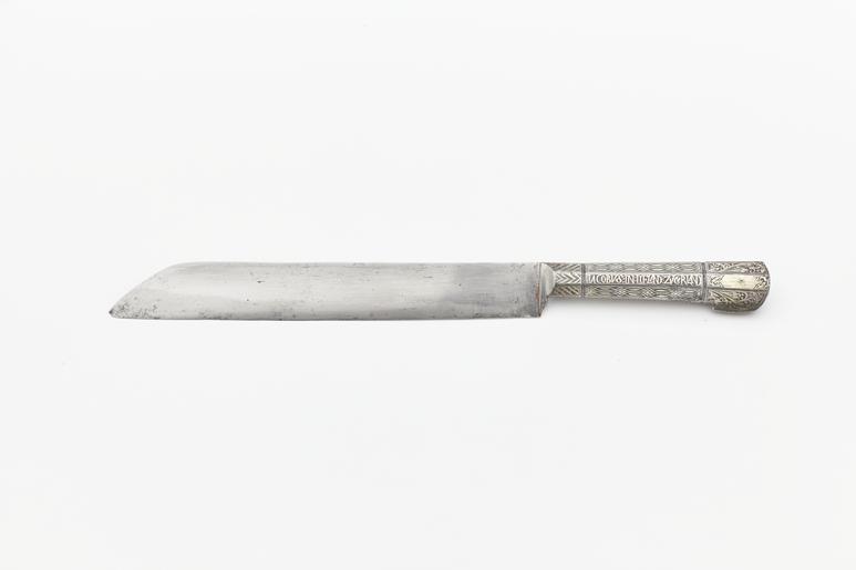 | Keywords: Trancherkniv, förskärare i stål 1640-tal - Skoklosters slott - 102840.tif LSH artwork sv Åttsidigt skaft av brunerat stål ihåligt ornerat med påslaget blekt guld och silver skaftets överdel med kam med konkava sidor utskjutande åt samma sida som bleckets eggsida kammen avslutad nedåt mot bladet med en näbbliknande udd På de två mellansidorna inskription med början på ena sidans överdel HERZ- IACOBVS IN LIFLAND ZV- CVRLAND VND SEMIGALIEN På övriga sidor geometriska bårdmönster av bågränder och närmast bladet sned-och vinkelställda tänder På överdelens båda mittsidor ett långsträckt fält med spetsiga ändar sidorna i övrigt med ytmönster av rankornament <br/>Blad rakt eneggat utan ornering Ryggsidan vid spetsen nedböjd till eggen <br/>Till trancherbestick inv nr 12274-12285 bestående av sex knivar fyra tvåkloiga gafflar och en trekloig gaffel original caption Trancherkniv förskärare i stål 1640-tal <br/> Nyckelord 1640-talet Knivar Föremålsbild Stormaktstiden decade 1640 size mm 331 size mm 30 size mm 215 blad SKO Barockfesten 2015 Skoklosters slott place of origin original filename sm_dig14734 33317 inventory number SKO 12277 102840 CC-BY-SA Erik Lernestål Knives 1640s Sweden 1611-1718 Cutlery Erik Lernestål Media contributed by LSH dim-with multiple size templates Media contributed by LSH 2015-11 |