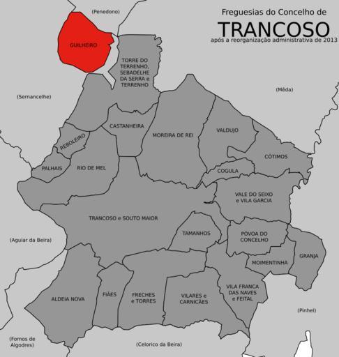 | Keywords: Trancoso Guilheiro localização.svg pt Localização da Freguesia de Guilheiro exclave do concelho de Trancoso Portugal en Location of the Civil Parish of Guilheiro exclave of the municipality of Trancoso Portugal 2014-04-28 19 46 11 File Trancoso freguesias 2013 svg Gazilion cc-zero Uploaded with UploadWizard Trancoso Exclaves and enclaves in Portugal SVG maps of freguesias in Portugal | ||||