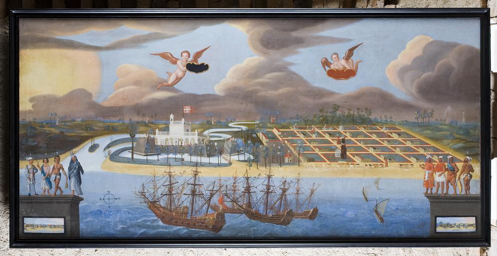 | Keywords: Tranquebar - Skoklosters slott - 86273.tif Tavlan tillkommen efter att fortet rustats upp av kvartermästaren Andersen Kongsbat En gren av Caleroon-floden omger det vita Dansborg-fortet på vars vänstra torn man kan se en stor palm I floden ligger Gallow-Tarna Bokstäverna i stadskvarten markerar a tullhuset c den södra husraden med Kongsbaks hus e den portugisiska kyrkan h pagoder i moskeer h hyddor I förgrunden fem fregatter <br/>Till vänster och till höger postament med vardera fyra figurer i olika klädnader Två svävande änglar hållande tomma kartuscher <br/><br/>Bakvänt E med röd färg till vänster på duken 9 med blyerts på nedre spännramen <br/>Ny kilad spännram Svart profilerad spikhål längs innerkanten tvärslå på höjden <br/><br/>A view of Tranquebar <br/>A view of the Danish colony of Tranquebar with the Dansborg fortress in south east India The painting is executed after the restauration of the fortress by Eskil Andersen Kongsbakke in 1657-58 Kongsbakke later built a wall around the town in 1660 which is not visible in the painting The letters in the town quarters represent a custom warehouse c the southern part with the house of Kongsbakke e the Portuguese church h the pagoda i mosques In the left and right corner of the canvas are figures dressed in various costumes <br/>The painting was taken as war booty by Carl Gustaf Wrangel during the war between Sweden and Denmark maybe from Frederiksborg Castle in 1660 original caption Tranquebar <br/> Nyckelord Målning Landskap Moln Puttisar Skepp Tranquebar Föremålsbild ca 1658 oil on canvas size mm 1325 2735 SKO Carl Gustaf Wrangel place of origin original filename sm_dig4170_9626 30728 inventory number SKO 9626 86273 PD Jens Mohr Jens Mohr Clouds in art Media contributed by LSH unmatched objKeyword Media contributed by LSH unmatched keyword Media contributed by LSH 2013-10 |