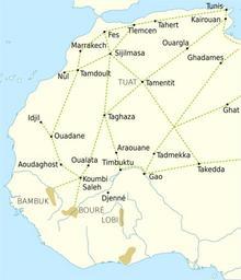 | Keywords: Trans-Saharan routes early.svg en Trade routes of the Western Sahara c 1000-1500 Goldfields are indicated by light brown shading Map Map data from http //www naturalearthdata com/ 1 50m data Projection Equirectangular - Lat/Long - plate carrée Map limits N 38N S 3N E 12E W 18W Software Grass GIS 6 4 1 Inkscape 0 48 1 Scaled x30 in Inkscape to give 30 pixels per degree Routes The routes shown are based those given by Mauny 1961 Mauny gives maps for three periods 8th-10th centuries on page 429 11th-13th on page 430 and after the 14th century on page 434 The position of the goldfields is based on Mauny 1961 page 295 Levtzion has published a map of the trade routes both in Levtzion 1973 and in Levtzion Hopkins 1981 The map shows Tahert modern Tiaret in Algeria to the south of Tlemcen In fact Tahert should be to the East and slightly to the North of Tlemcen The map also shows Tamentit on the Draa River In fact Tamentit is one of the oases of Tuat “ and instead the town of Tamdoult Tamdult lay near Akka to the north of the Draa A map showing trade routes 10th to 16th centuries is given in Cuoq 1975 on page 11 This map repeats the error made by Levtzion 1973 in placing Tahert to the south of Tlemcen Toponyms Assumptions the capital of Ghana was at Koumbi Saleh Takedda was at Azelik Aoudaghost was at Tegdaoust The Malian capital has not been included - there is no consensus on the location Orthography Aoudaghost - Awdaghost - Awdaghust Araouane - Araouane - Arawan Ouadane - Ouadane - Wadan Oualata - Oualata - Walata Ouargla - Wargla - Wargala Sijilmasa - Sidjilmassa - Sijilmasa References citation Cuoq Joseph M translator and editor 1975 Recueil des sources arabes concernant l'Afrique occidentale du VIIIe au XVIe siècle BilÄd al-SÅ«dÄn Éditions du Centre National de la Recherche Scientifique Paris French 11 Reprinted in 1985 with corrections and additional texts ISBN 2222017181 citation Levtzion Nehemia Ancient Ghana and Mali Methuen London 1973 0841904316 138-139 Reprinted 1980 citation Levtzion Nehemia Hopkins John F P eds and trans Corpus of Early Arabic Sources for West Africa Marcus Weiner New York NY 2000 1-55876-241-8 xxii First published in 1981 by Cambridge University Press ISBN 0521224225 citation Mauny Raymond 1961 Tableau géographique de l'ouest africain au moyen age d ™après les sources écrites la tradition et l'archéologie Institut français d'Afrique Noire Dakar French 426-432 Further reading citation Devisse J 1988 Trade and trade routes in West Africa el Fasi M General History of Africa Volume 3 Africa from the Seventh to the Eleventh Century Berkeley University of California Press 367-435 0520039149 Includes a map of the Sahara showing isohytes and schematic diagrams of the trade routes with the number of stages specified by Ibn Hawkal al-Bakri and al-Idrisi 2011-08-05 own Aa77zz cc-zero Uploaded with UploadWizard Sahara Trade routes Maps showing history of Africa |