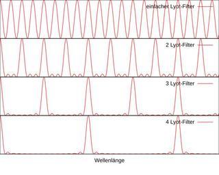 Keywords: Trans.svg en Theoretical transmission of four successively applied Lyot filter The lyot filter have half of the width of the previous one own Svebert 2011-05-14 Cc-zero Optical filters