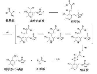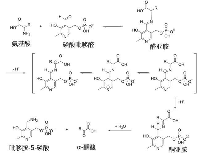 | Keywords: Transamination mechanism (zh-cn).svg reaction of an amino acid with pyridoxal-phosphate to a Schiff-base aldimine Transamination between an amino acid an pyridoxal-phosphate Pyridoxalphosphat_aldimin svg Transaminierung_mechanismus_de svg 2011-03-29 05 45 UTC Pyridoxalphosphat_aldimin svg User Alcibiades Transaminierung_mechanismus_de svg User Alcibiades derivative work Shakiestone <span class signature-talk >talk</span> translation Transaminierung_mechanismus_de svg </nowiki> Uploaded with derivativeFX Coenzymes Organophosphates Acid-base reactions Organic reactions |