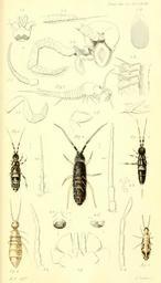 | Keywords: TransEntSocLond1plate11.jpg s of the Irish Species of Thysanura PLATE XI FORBICINA Geoff Sp 1 Polypoda Linn Plate XI Fig 1 Very common in dry stone ditches and mossy places Fig 1 Outline of the animal magnified la Head seen in front 1b Superiorly 1 c Antenna 1d Last joint of the palpus 1 e The foreleg 1f The hind foot 1g Jaws which are very thin and membranous 1 h Inside showing the auxiliary legs; the back is placed to the right 1 l The auxiliary foot with which it ascertains the presence of the object against which the tail is adpressed 1k A scale much magnified to show the lines producing the iridescence from 9 000 to 11 000 in an inch ORCHESELLA Sp 1 Orchesella filicornis Plate XI Fig 2 Fig 2 Insect magnified 2 a Left antenna Sp 2 Orchesella cincta vaga Fab Plate XI Fig 3 Fig 3 Insect magnified PODURA Linn Sp 1 Podura plumbea Linn Plate XL Fig 4 Fig 4 The insect magnified 4 a Left antenna 4 b Configuration of the left eyes 4c Represents the mouth; x the positions of the antennae; + a cylindric ring moveable and inclosing the manducatory organs ; ° the labium transverse striated longitudinally in the middle and with a minute hemispheric tubercle laterally closely adpressed against ° in the state of rest 4° The labrum fimbriated at its apex along the diameters of two convex semicircles placed on the basal part of the lip There is no appearance of lateral pieces internally or anything resembling maxillae These lips are moved to and fro with considerable rapidity but seem to have little prehensile power as they were unable to seize upon the minute hairs of the sable pencil which I passed into the mouth A singular apparatus is protruded from the 1st abdominal ring beneath which will be noticed under Podura stagnorum it is common to all the Podurae Sp 2 Podura nitida Plate XI Fig 5 Fig 5 Insect magnified 5 a Antenna of left side Sp 3 Podura nigro-maculata minuta Fab Plate XI Fig 6 Fig 6 Insect magnified 6a Antenna of left side seen in profile 2011-06-24 http //www biodiversitylibrary org Robert Templeton PD-old-100 Uploaded with UploadWizard Robert Templeton Plates Transactions of the Entomological Society of London |