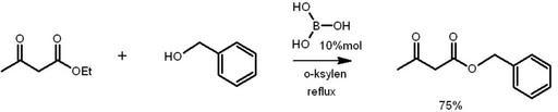| Keywords: Transesterification-boronic acid.png en Transesterification catalysed by boric acid pl transestryfikacja katalizowana kwasem borowym own praca wzorowana na Tetrahedron Letters Volume 49 Issue 1 1 January 2008 Pages 106-109 Filips Filip Stefaniak Cc-zero Organic reactions |