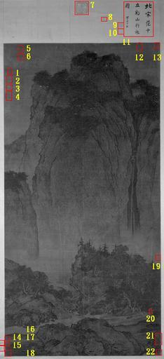 Keywords: Travelers Among Mountains and Streams seals and inscriptions.png 中文:谿山行旅 的印鑑 題跋說明 石渠寶笈 ,清高宗之印 重華宮鑑藏寶 ,清高宗之印 宣統鑑賞 ,清宣統 之印 無 齋精鑒璽 ,清宣統 之印 嘉慶御覽之寶 ,清仁宗之印 宣統御覽之寶 ,清宣統 之印 乾隆御覽之寶 ,清高宗之印 金粟山藏經紙 ,金粟寺 宗伯學士 ,董其昌之印 董其昌印 ,董其昌之印 北宋范中立谿山行旅 ,董其昌 ,董其昌題跋 乾隆御覽之寶 ,清高宗之印 乾隆御賞之寶 ,清高宗之印 蕉林祕玩 ,梁清標之印 其大略 ,梁清標之印 祚新之印 ,周祚新之印,印主為明崇禎丁丑科(1637) 士 墨農鑑賞 ,周祚新之印 忠 之家 ,錢惟演或錢勰之印 樂善堂 書記 ,清高宗之印 范寬 ,范寬之印 (典禮 察)司印 ,明 官印 華山房 ,印主不明 <br>English Travelers Among Mountains and Streams seals and inscriptions Image Travelers Among Mountains and Streams png 中文:2007年2 5日 User Droxiang Droxiang zh Fan Kuan Shan shui paintings in the National Palace Museum Paintings of mountains Pines in art Paintings of the Song Dynasty Scrolls of China Ink and wash paintings in China Landscape paintings of China Chinese literati paintings Chinese silk Ancient Chinese art Art of China Art in China Artists from China Collections of art in China Art from Asia 11th-century paintings Taoism in China |