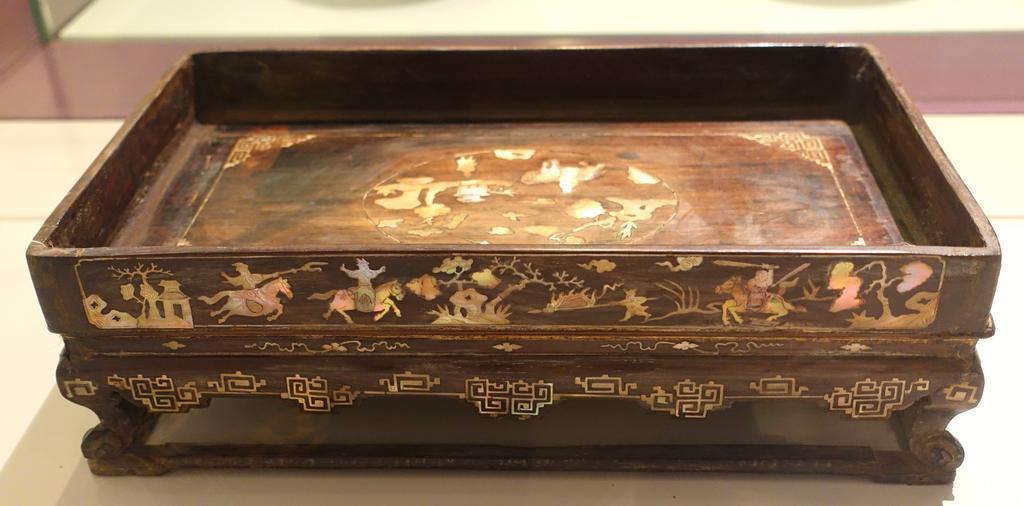| Keywords: Tray for betel chews, Bac Ninh, late 19th century, view 2, wood inlaid with mother of pearl - Vietnamese Women's Museum - Hanoi, Vietnam - DSC04171.JPG en Exhibit in the Vietnamese Women's Museum Hanoi Vietnam Photography was permitted in the museum without restriction 2014-08-04 03 48 12 own Daderot other versions cc-zero Wooden containers in the Vietnamese Women's Museum Uploaded with UploadWizard | ||||