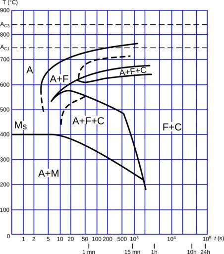 Keywords: TRC 16MnNiMo5.svg en Continuous cooling transformation diagram of 16MnNiMo5 steel 16MND5 equivalent to ASTM A508 Cl 3 A austenite; A<sub>C1</sub> temperature of α+perlite †’ α+γ transformation when heating; A<sub>C3</sub> temperature of α+γ †’ γ transformation when heating; C cementite; F ferrite; M martensite; M<sub>s</sub> martensite start fr Diagramme TRC de l'acier 16MnNiMo5 16MND5 équivalent à l'ASTM A508 Cl 3 A austénite ; A<sub>C1</sub> température de transformation α+perlite †’ α+γ au chauffage ; A<sub>C3</sub> température de transformation α+γ †’ γ au chauffage ; C cémentite ; F ferrite ; M martensite ; M<sub>s</sub> début de la martensite martensite start own Cdang 2009-05-29 Created with Inkscape Continuous cooling transformation diagrams |