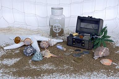 Keywords: treasure chest sand squid palm starfish mussels coins treasure valuable recover time out recovery coupon travel fishing net chest money open box currencies specie loose change metal wood cash metal money finance pay points of the compass