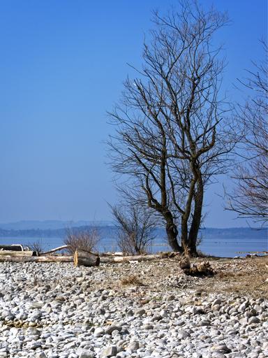 Keywords: tree bank beach lake landscape chiemsee bavaria nature stones water waters relaxation rest idyll weather holiday mood relax coast nature conservation holidays recovery seaside resort blue blue sky nice weather