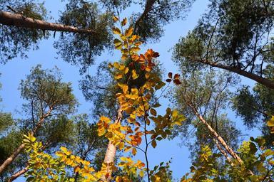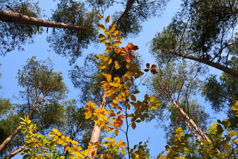 Keywords: tree canopy autumn green foliage nature forest sunny colorful plant blue sky sky