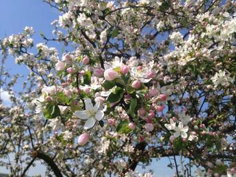 Keywords: tree flowers apple tree spring pink pink flower nature garden fruit tree honey bee white branches vernal beauty sky background ornamental blue sky flowering