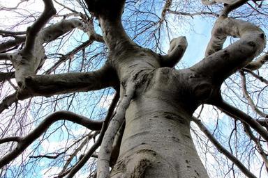 Keywords: tree gnarled twisting twisted wood bark branches blue sky