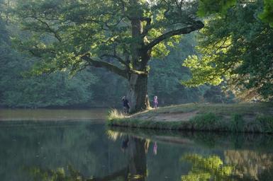 Keywords: tree leaves green light water mirroring bank lake mood nature recovery out