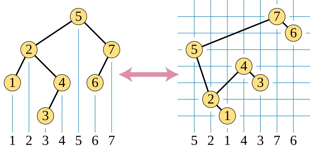 | Keywords: Tree permutation bijection.svg binary trees with nodes labeled in left-to-right order and stack-sortable permutations generated by listing the same node labels in preorder 2016-03-21 own David Eppstein other versions cc-zero Binary trees Permutations |