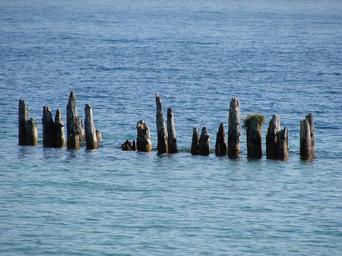 Keywords: tree stumps lake water sunshine blue summer scenery