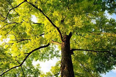 Keywords: tree treetop trunk canopy branch leaf foliage wood lush sky texture bright sunshine summer
