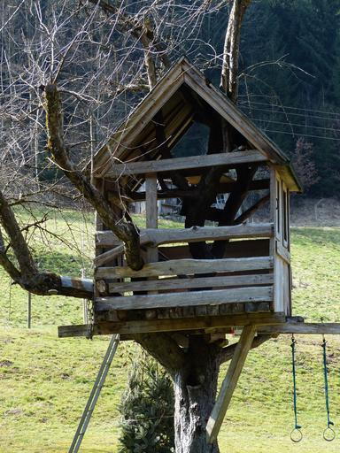 Keywords: treehouse tree hut home vacation tree play children retreat playful lebensmittelpunkt boards nails battens daring shaky