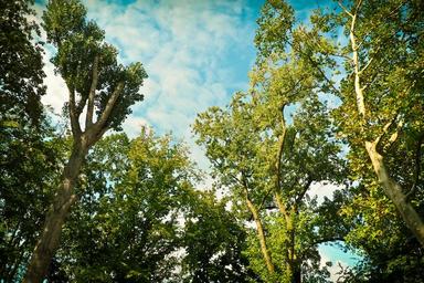 Keywords: trees birch nature aesthetic tribe forest wood skyward series summer green landscape leaves sun sky plant branches walk hiking mood strains atmosphere deciduous forest treetop rest clouds idyll harmony