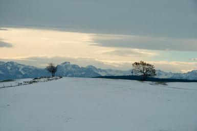Keywords: germany nature bavaria landscape mountains snow winter trees sky clouds field farm cloudy