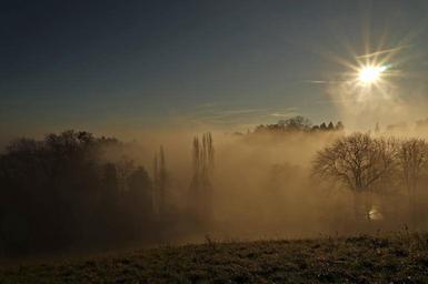 Keywords: trees sunbeam light rays autumn forest nature fog