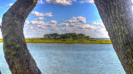 Keywords: trees water river island clouds blue sky