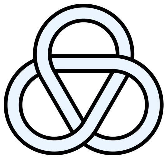 Keywords: Trefoil-triquetra-circular-arcs-around-triangle.svg A form of the Triquetra symbol or trefoil knot with three 240° circular arcs grouped around an equilateral triangle ribbons version See File Trefoil-triquetra-circular-arcs-around-triangle_ solid svg for a solid version See Image Trefoil-of-trefoil svg for a recursive version of this Self-made graphic converted from the following vector PostScript source code <pre> 240 518 translate/z 20000 sqrt def 27 setlinewidth 92 96 1 setrgbcolor 0 0 100 330 90 arcn z 0 100 90 210 arcn z 2 div 15000 sqrt 100 210 330 arcn closepath gsave 45 setlinewidth 0 setgray stroke grestore stroke 45 setlinewidth 0 setgray 0 0 100 329 271 arcn stroke z 0 100 89 31 arcn stroke z 2 div 15000 sqrt 100 209 181 arcn stroke 27 setlinewidth 92 96 1 setrgbcolor 0 0 100 330 270 arcn stroke z 0 100 90 30 arcn stroke z 2 div 15000 sqrt 100 210 180 arcn stroke showpage EOF</pre> Knots in art and decoration Interlaced triquetra Trefoil knot diagrams with 3-fold rotational symmetry Knots and links on transparent background Outline knots and links |